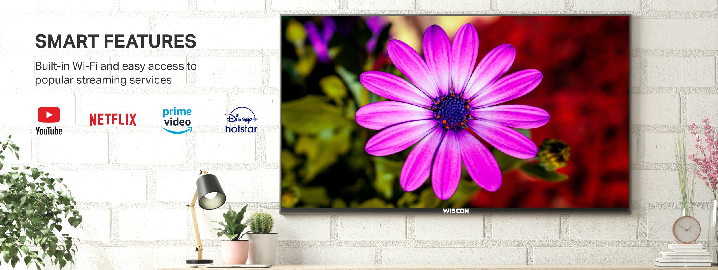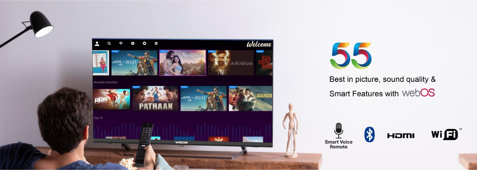 Elevate your home entertainment experience with Wiscon's 55-inch Full HD LED TV. Immerse yourself in stunning picture quality and enjoy versatile connectivity options with the two USB and HDMI ports. The Next Gen Processor with 1.5GB RAM and 16GB of ROM delivers lightning-fast performance, while the 20W Speaker Outputs with tube speakers provide an audio experience like no other, with deep and rich bass. This feature-packed LED TV also comes equipped with SMART features, allowing you to access your favorite streaming platforms with just the touch of a button. With built-in WIFI, you can effortlessly connect to the internet and enjoy endless entertainment options. Make the upgrade to Wiscon's LED TV for a truly exceptional home viewing experience. This SMART LED TV will also allow you to access popular streaming platforms like Netflix, Amazon Prime, Disney Hotstar, Zee5 and Youtube with just the touch of a button. With its built-in WIFI, you can easily connect to the internet for endless entertainment options.